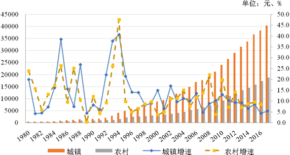 图1 1980-2017年北京市城乡居民人均消费支出及增速
