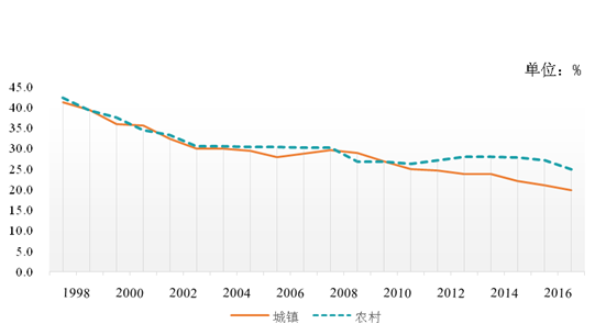 图2 1998-2017年北京市城乡居民恩格尔系数变化情况